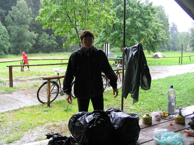 Popis: Další den ráno v kempu v Horní Vltavici - zase prší. Rozhodujeme se, že to balíme a jedeme do Brna.